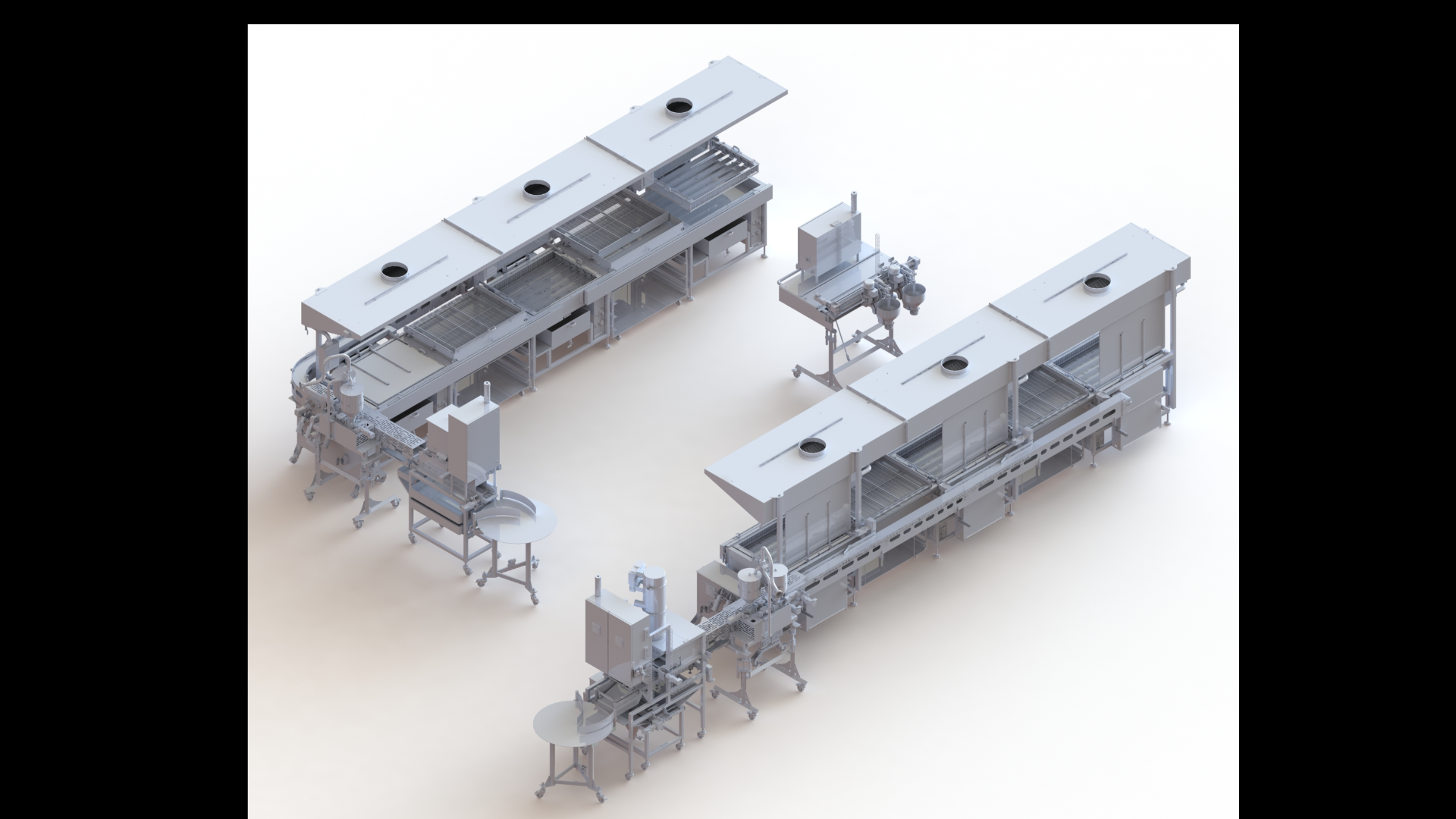 Links- oder Rechtslaufend, als reine Backstation, zwei oder drei Standgeräte in der Reihe verbunden, mit oder ohne Dunstabzugshaube, mit Schwenkarm, Dosiertisch oder vollautomatischer Dosierstation mit bis zu zwei Dosier- & Formgeräten und manueller oder vollautomatischer Abholung der fertig gebackenen Siedegebäcke,