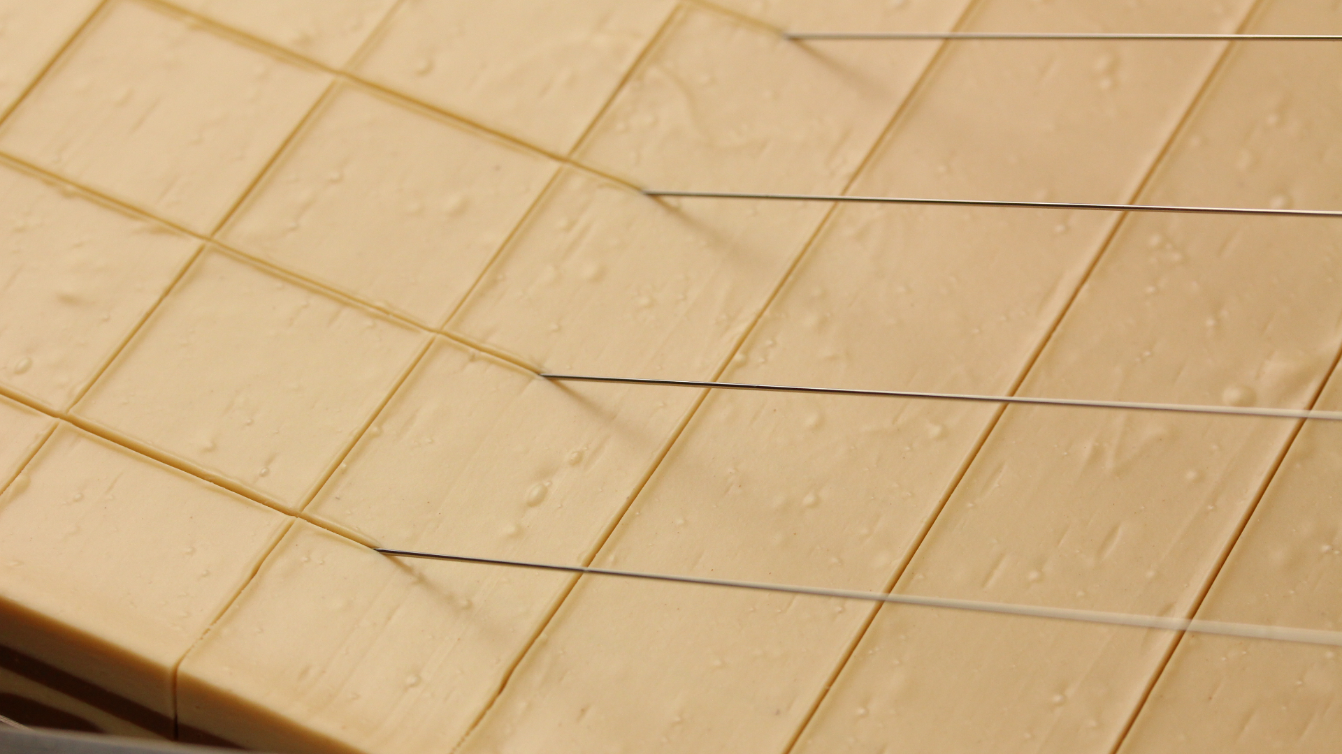 eignet sich hervorragend, um Pralinenmassen, Fettmassen, Butter, Gianduja, Marzipan, Fondantkaramel, Ganache, Geleemassen, Petit Fours, Schnittpralinen u.ä exakt zu Quadraten, Rechtecken und Rauten zu schneiden. Die zu zerschneidende Pralinenmasse-Platte von 360 x 360 mm erhält man durch Ausrollen zwischen Schienen oder durch Ausgießen in Gießrahmen oder Gießblechen, die wir auch nach Ihren Maßen anfertigen.