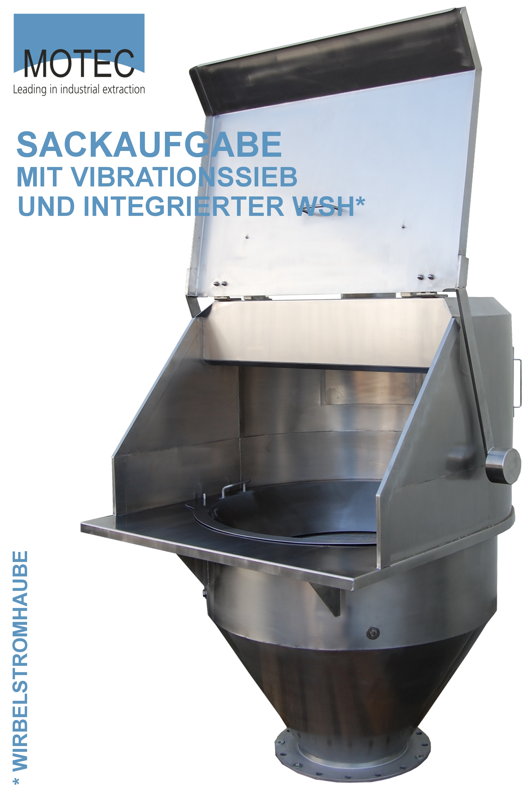 The MOTEC bag feed hopper is equipped with a deposit table at an ergonomic working height so that the bagged goods can be deposited on it and cut open. The hopper can be equipped with different sieve inserts to separate foreign bodies from the product flow. We also offer an integrated vibrating sieve for clumping products and particularly fine protective sieving.